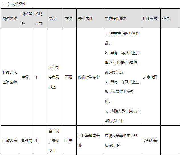 因醫(yī)院業(yè)務拓展,現(xiàn)面向社會公開招聘腫瘤介入主治醫(yī)師1名,以人事代理身份管理,行政人員1名,以勞務派遣身份管理。具體事項公告如下: